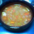 入ってるのは玉ねぎ、人参、セロリ、ベーコン、固形スープ、塩・胡椒、ケチャップです。バターか油で玉ねぎ・ベーコンいためて、人参セロリ入れたら水入れて~・・・と言う感じで。
